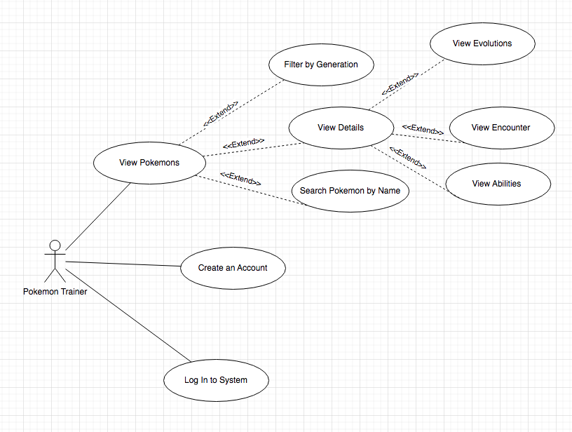 The use cases are the description that explains how the user should be able to use the product for the completion of the task. A Use case depends on Users action and the system responses to the users action.Once that we have already covered these features with one of the methods presented above , we can continue with the next steps that consist in design your wireframes and then the Prototipes of the UI’s.At this point is important to have already identified your use cases, once that all the parts approved this diagram(Stakeholders, Team Leads,Product Owner,UX Leads,…) now we can start to design the wireframes and then the prototipes.For example this is a Diagram of Use Cases that I created for the Pokedex UI project:
